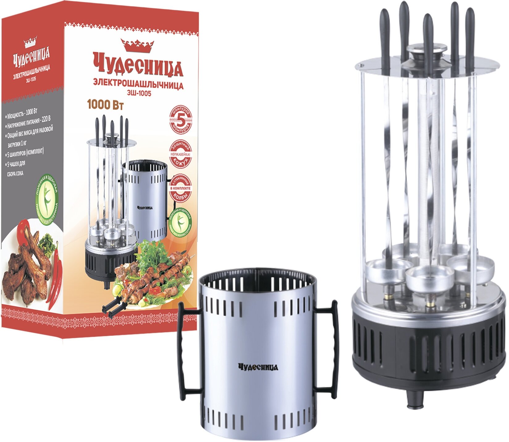 Type: barbecue, power: 1000 W, control: mechanical, features: non-stick coating, contact grill, fat collection tray, number of skewers: 5