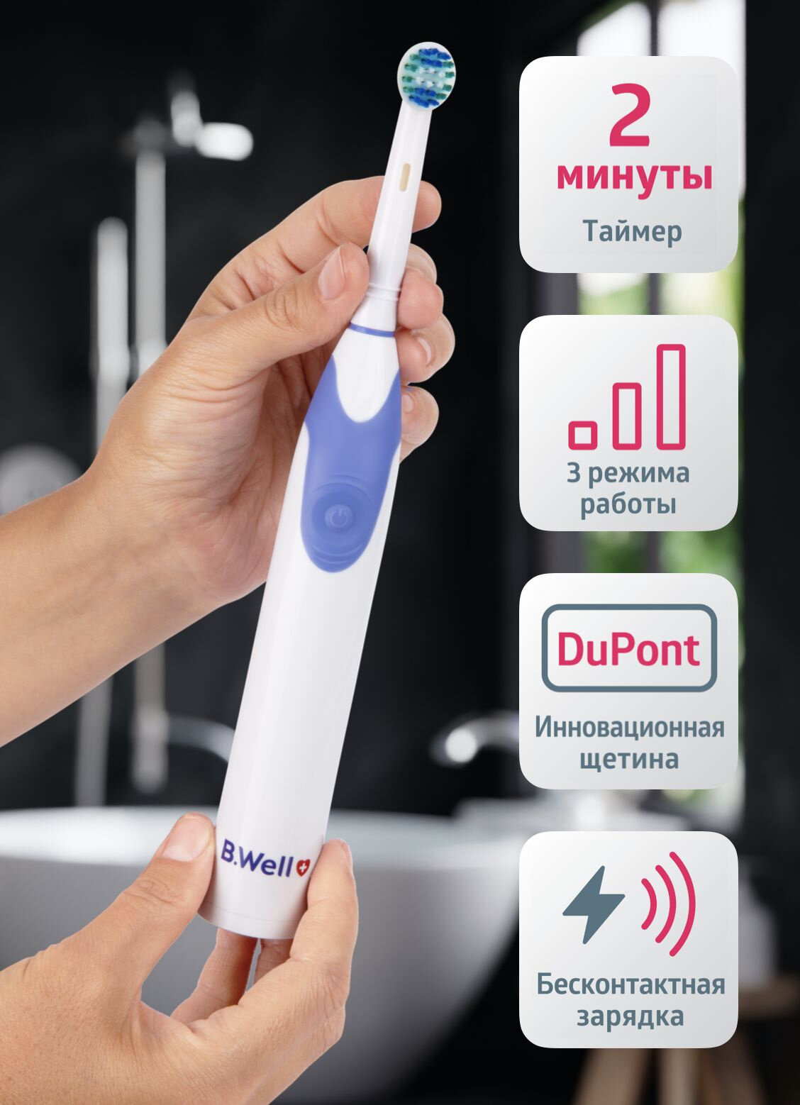 Purpose: for adults, type of brush: sonic, power supply: battery, operating modes: delicate cleaning, daily cleaning, whitening, nozzles: standard, number of nozzles in the set: 1, additional functions: �