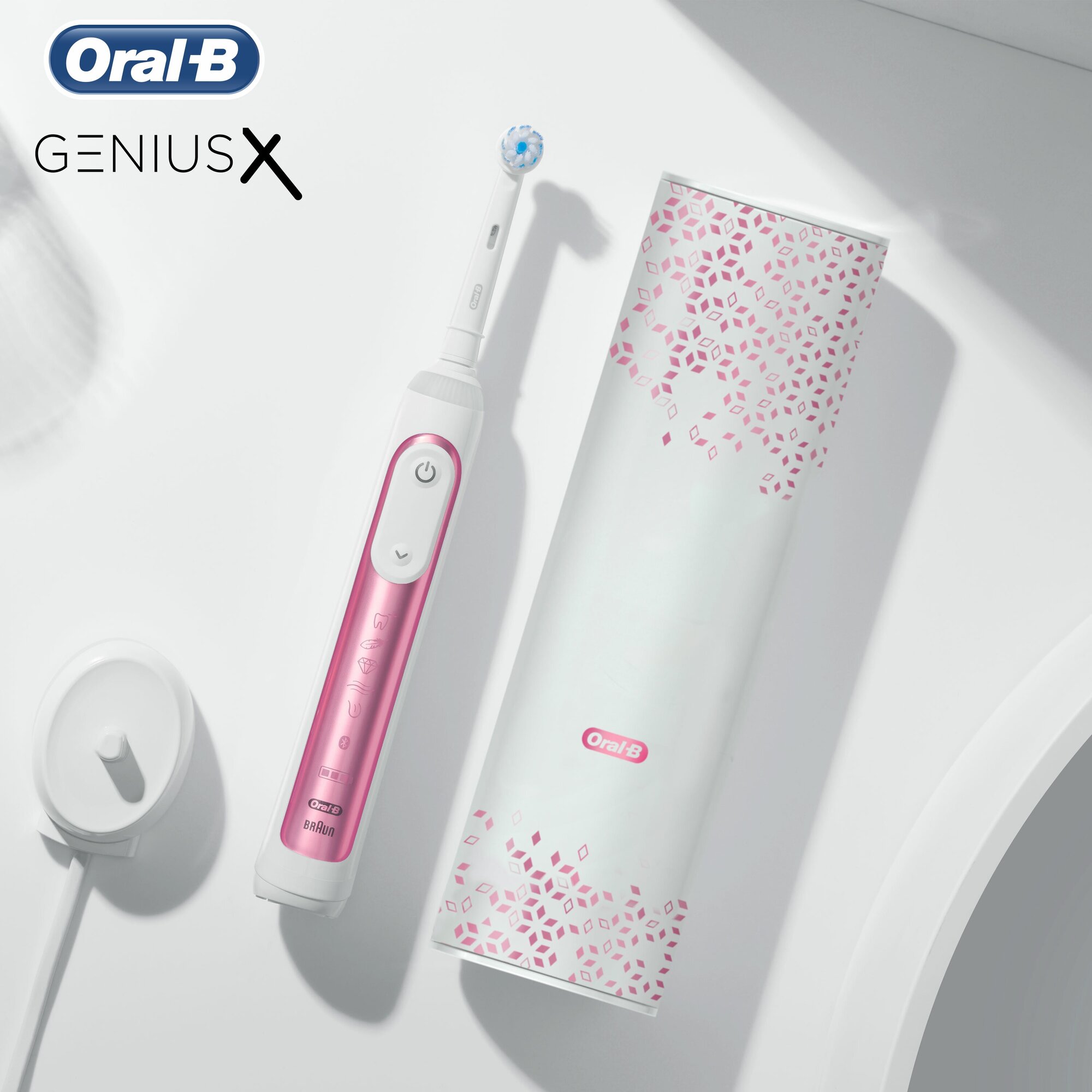 Artificial intelligence system with motion sensors, 12 Smart Ring LED lighting options, professional cleaning mode, travel case allows you to simultaneously charge your toothbrush and phone