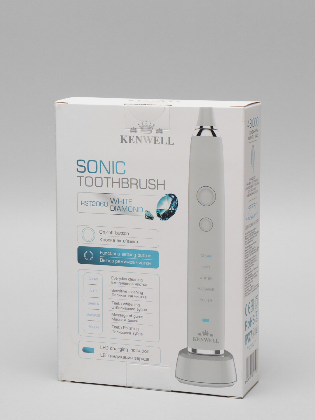 Bristles nozzles from DuPont; nozzles with a scrub for the tongue and silicone coating to protect against damage to the enamel; up to 14 days on a single charge