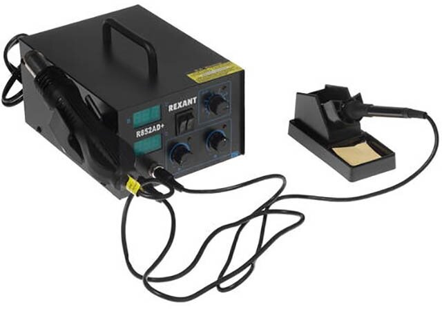 Main unit, hot air gun, soldering iron, soldering iron holder, hot air gun holder, sponge for cleaning the tip of the soldering iron in the lodgement, 3 nozzles for hot air guns of different sizes
