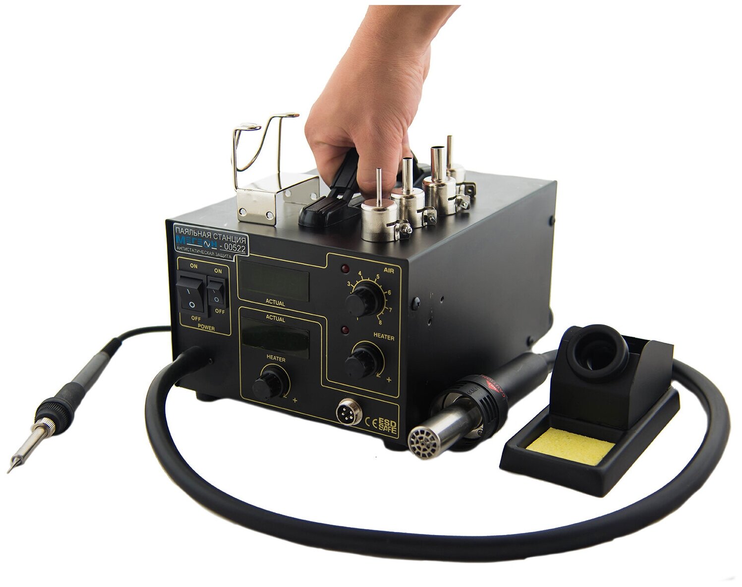 Soldering station MEGEON 00522 non-switchable hot air gun - 1 pc., soldering iron - 1 pc., stand - 2 pcs., hot air gun tips - 4 pcs., power cord - 1 pc., sponge for cleaning the soldering iron - 1 pc., instruction manual - 1 copy,
