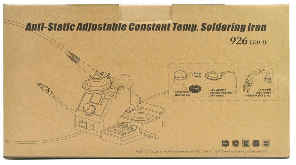 Soldering iron, magnifying glass, circuit board holder.