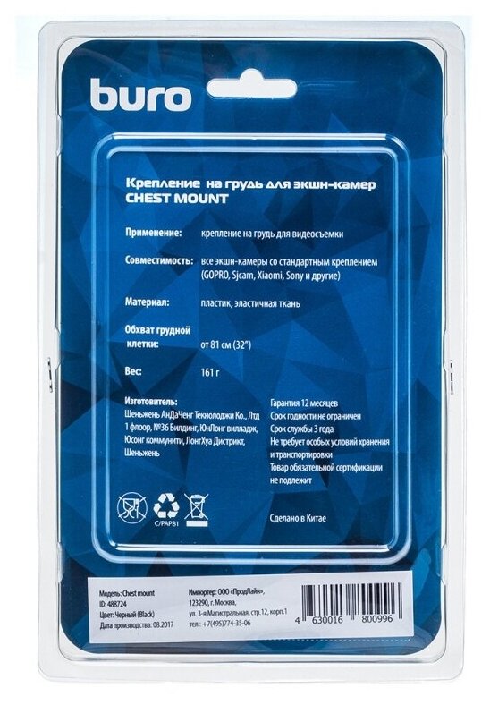 Type: mount, mount installation: chest, compatible action camera brands: GoPro, SJCAM, Sony, Xiaomi, material: plastic, elastic fabric