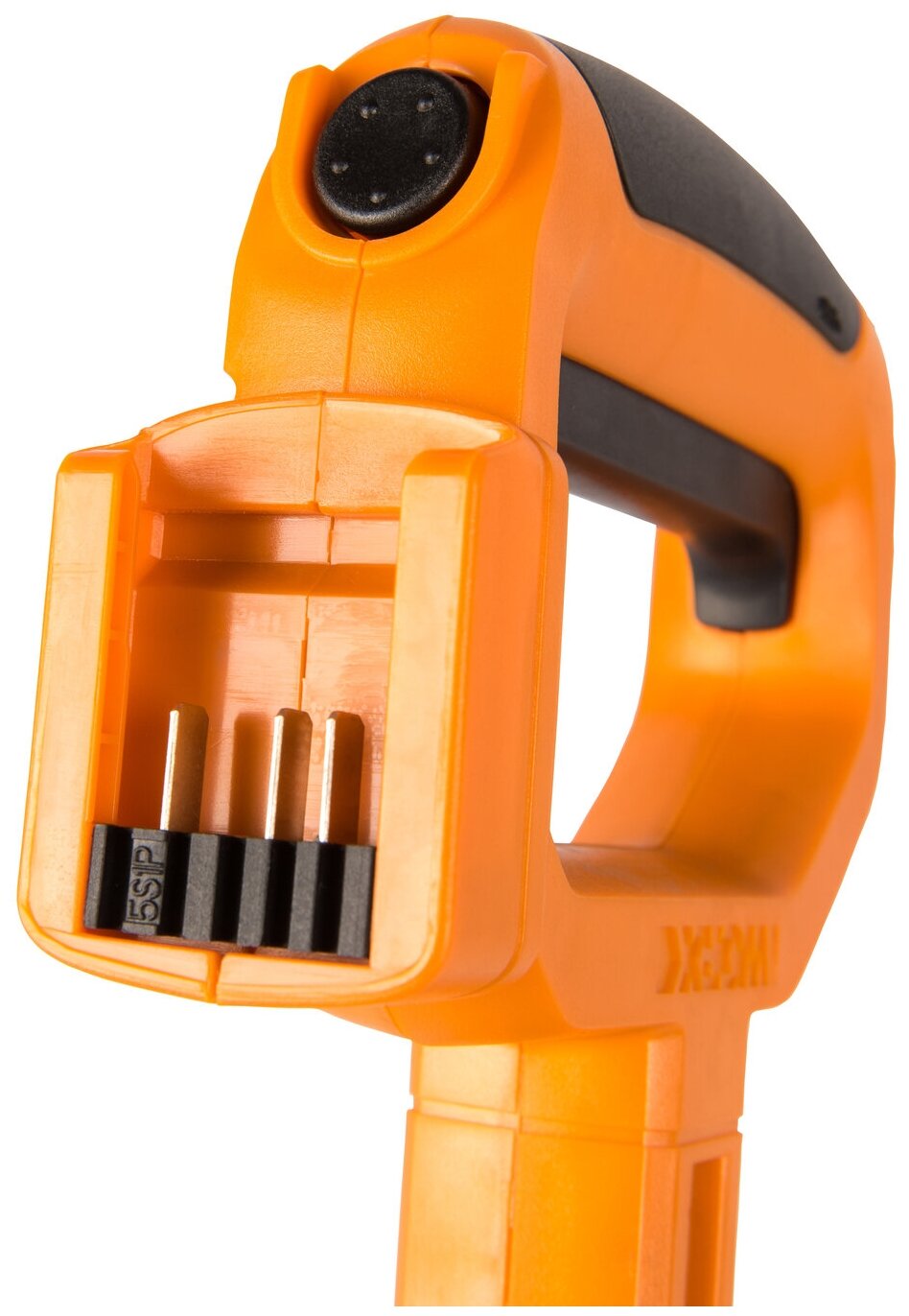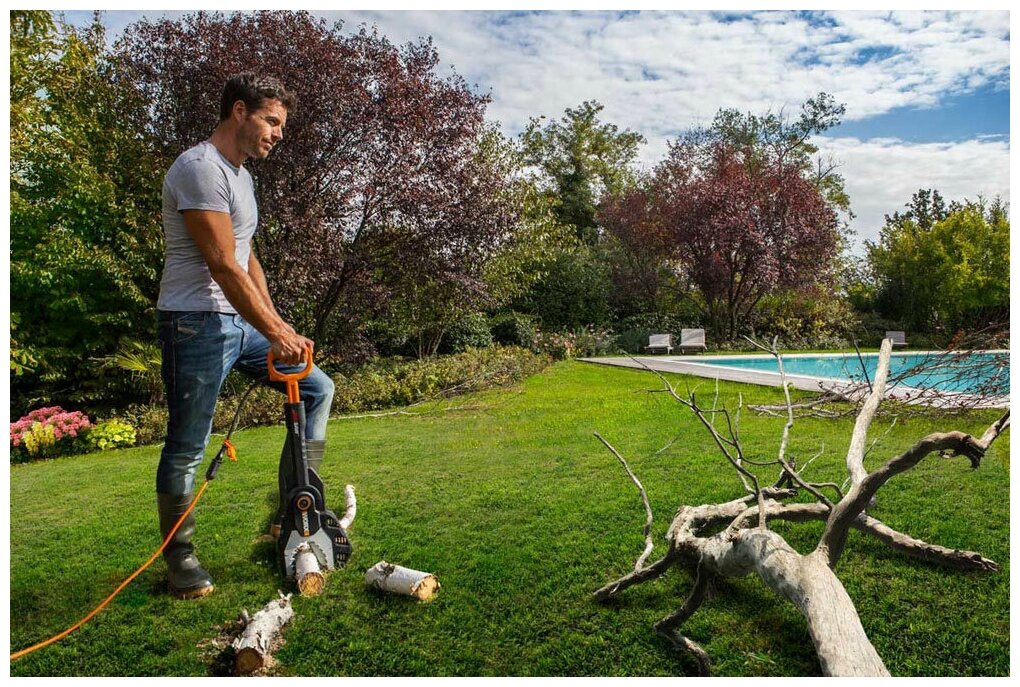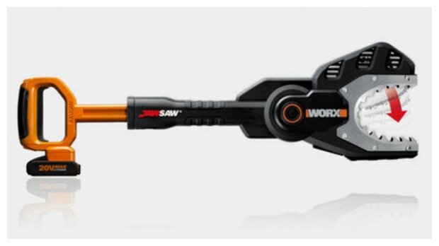 The WORX JawSaw 20 V, 2.0 Ah WG329E.5 cordless chain saw is suitable for sawing trees up to 10 cm in diameter. The blade body eliminates blade contact with the ground for easy sawing of logs and branches. Battery operation