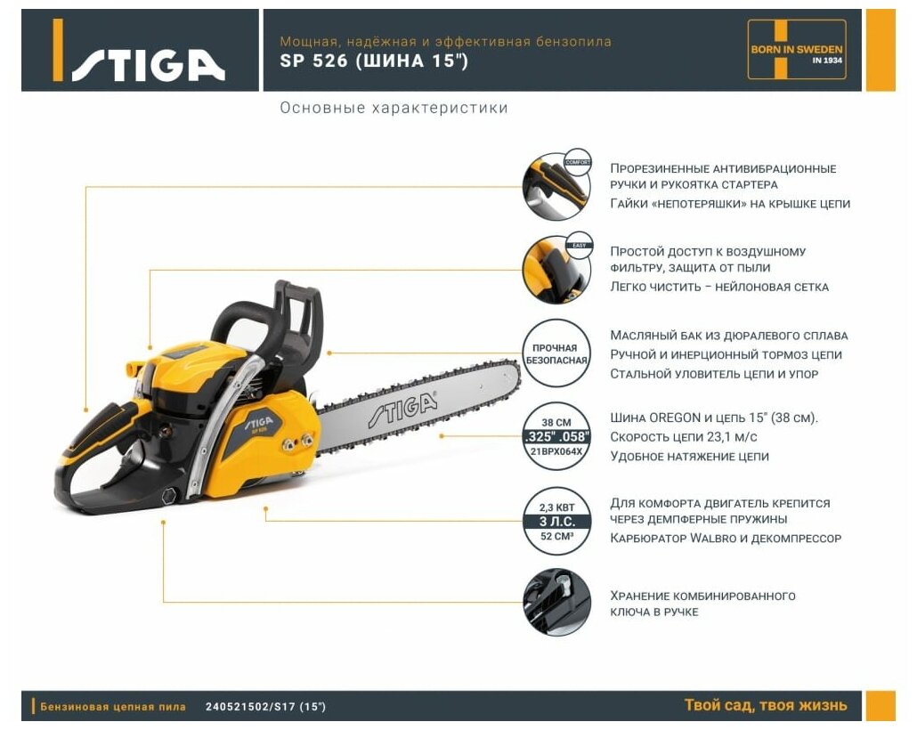 Engine type: gasoline, Power W: 2300 W, bar length: 38 cm, chain pitch: 0.325 inch, engine size: 52 cm³, anti-vibration, weight: 5.30 kg