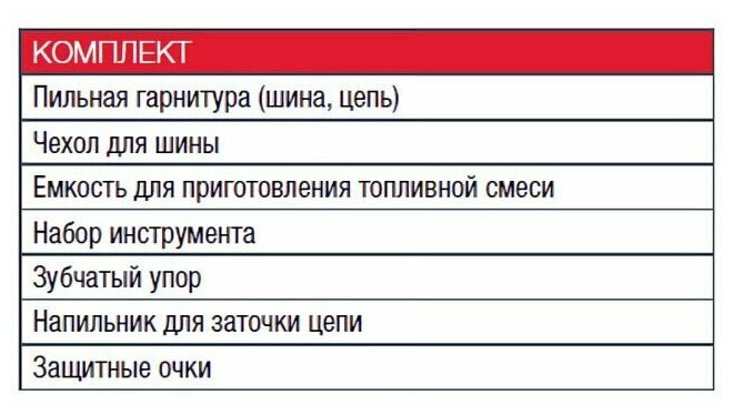 Bar, chain, tire cover, fuel mix container, tool kit, goggles, chain file