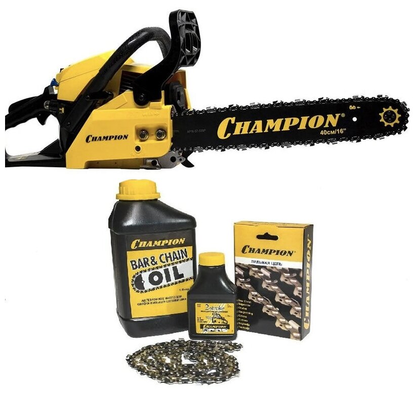 Chainsaw, guide bar, saw chain, spark plug wrench, carburetor adjustment screw driver, champion saw chain and bar oil 1 l, champion fuel additive 0.1 l, champion chain 3/8"-1.3 mm-56 r., instruction manual exploitation