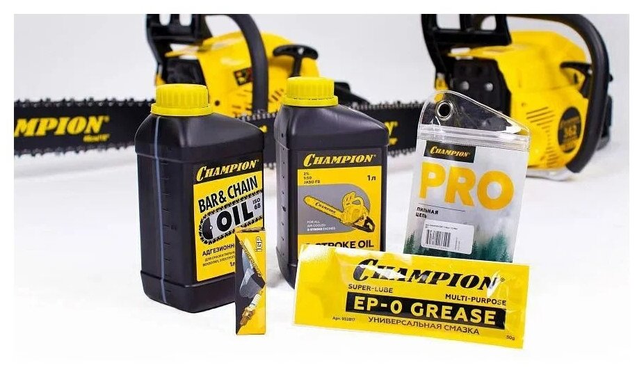 Mineral oil for 2-stroke engines Champion JASO FB 1 l – 1 pc., oil for lubricating saw chains and Champion bars 1 l – 1 pc., spark plug IGP L7T – 1 pc. 1 pc., Champion EP-0 universal grease 50 g – 1 pc.