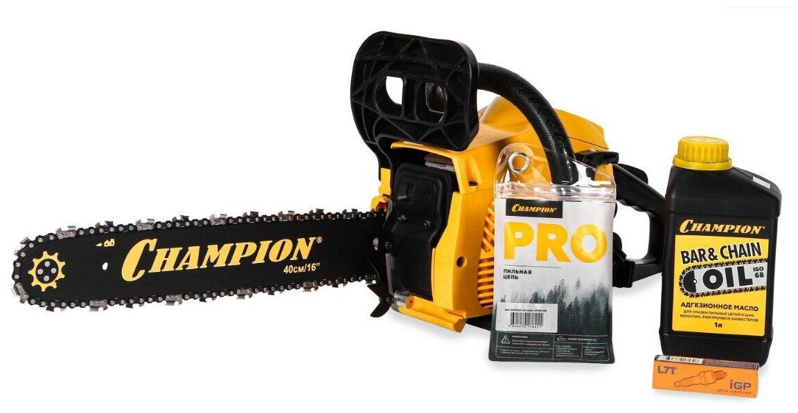 Petrol chainsaw CHAMPION 237-16 + chain oil, spark plug, grease and chain