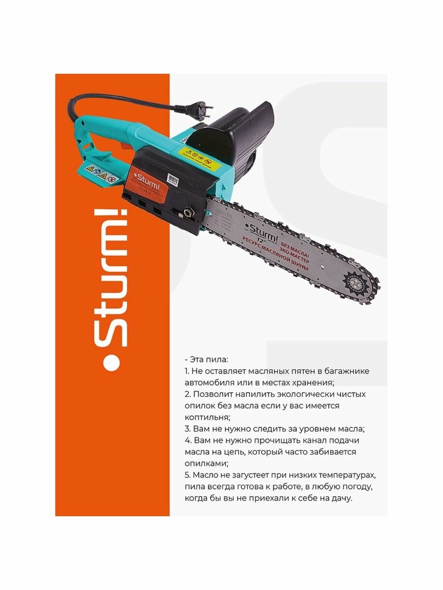Description: Motor type: electric, power W: 1600 W, bar length: 30 cm, chain pitch: 3/8 inch, cutting length: 300 mm, weight: 2.90 kg