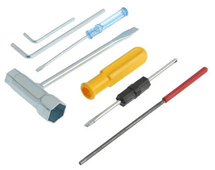 A container for preparing the mixture, a toothed stop, an L-shaped hexagon wrench, a candle key, a file, a screwdriver, a chain, a tire, a protective cover for the tire, a tool bag.