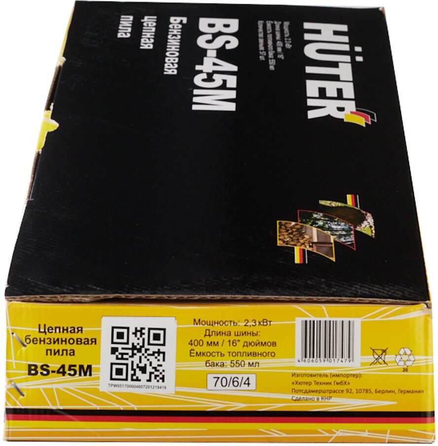 Description: Engine type: gasoline, Power W: 2300 W, HP power: 3.10 HP, bar length: 40 cm, chain pitch: 3/8 inch, engine size: 45 cm³, cutting length: 450 mm, anti-vibration , weight: 7 kg