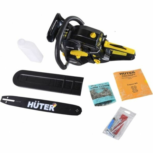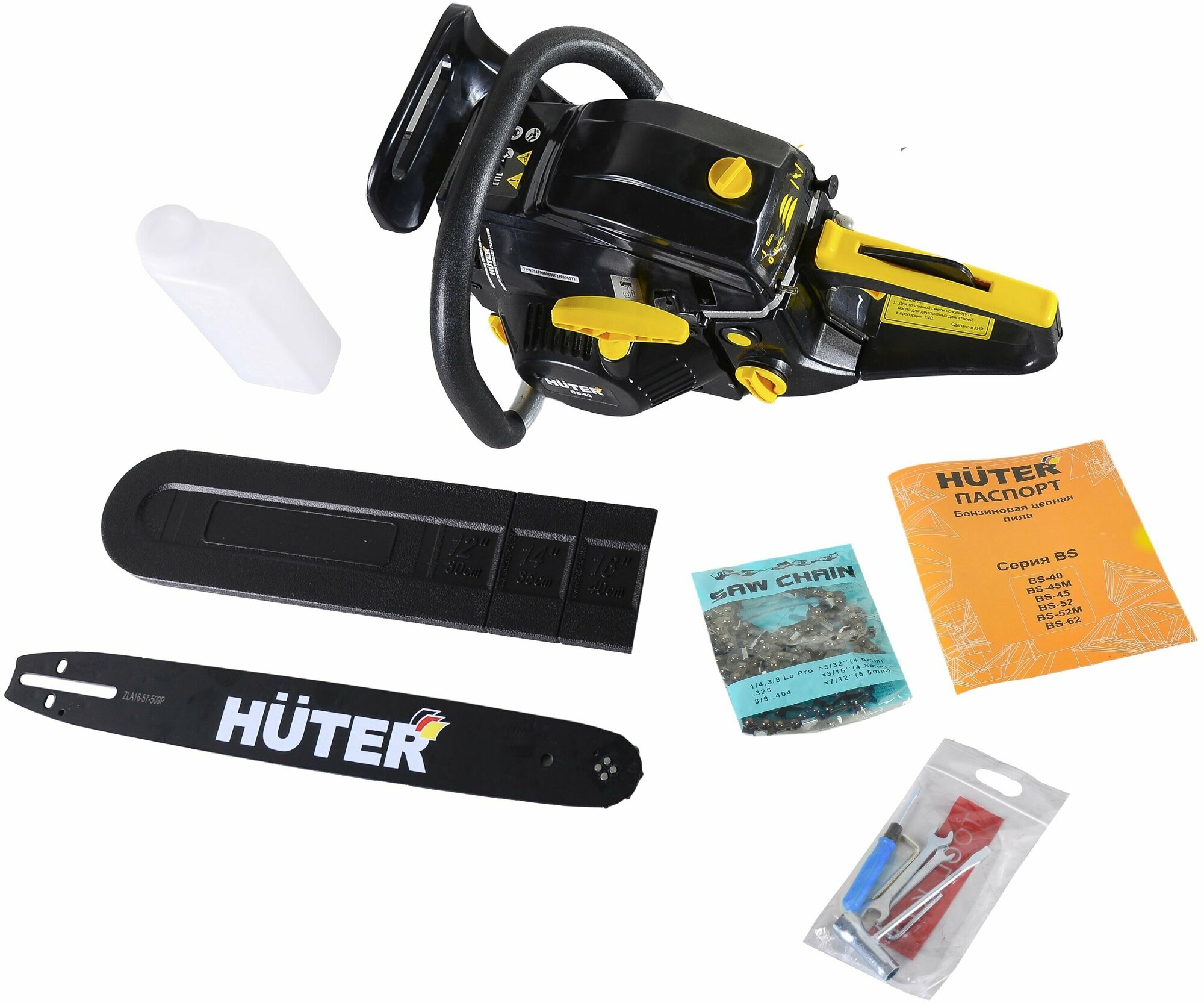 Bar, chain, guard, toothed stop, mixing container, tool kit