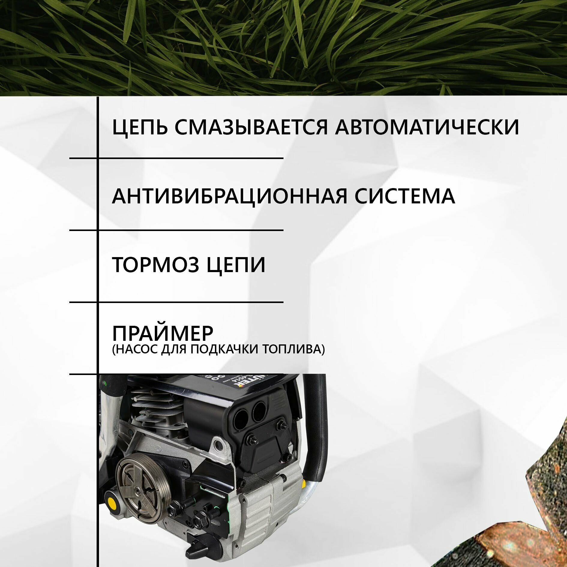 Chainsaw - 1 pc. Tire - 1 pc. Chain - 1 pc. Protective casing of the tire - 1 piece. Tank for mixing the fuel mixture - 1 pc. Product data sheet Tool kit and accessories