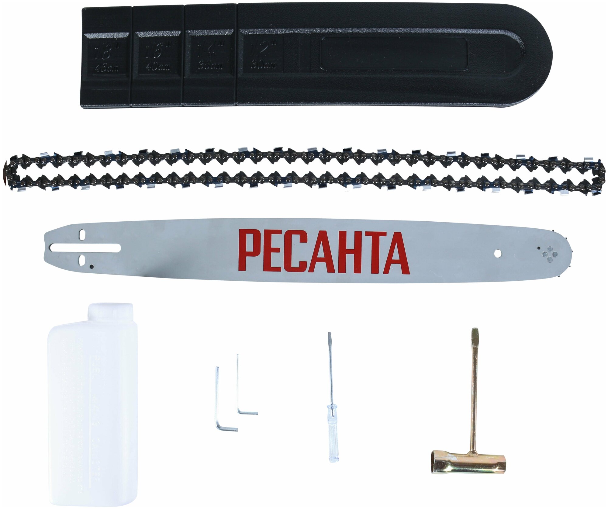 Chainsaw - 1 pc., bar - 1 pc., chain - 1 pc., protective casing of the bar - 1 pc., container for mixing the fuel mixture - 1 pc., product data sheet - 1 pc., set of tools and accessories - 1 pc. .