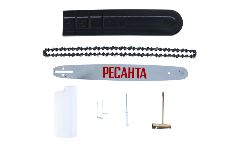 Chainsaw - 1 pc. Tire - 1 pc. Chain - 1 pc. Protective casing of the tire - 1 piece. Tank for mixing the fuel mixture - 1 pc. Product passport - 1 pc. Set of tools and accessories - 1 pc. Package