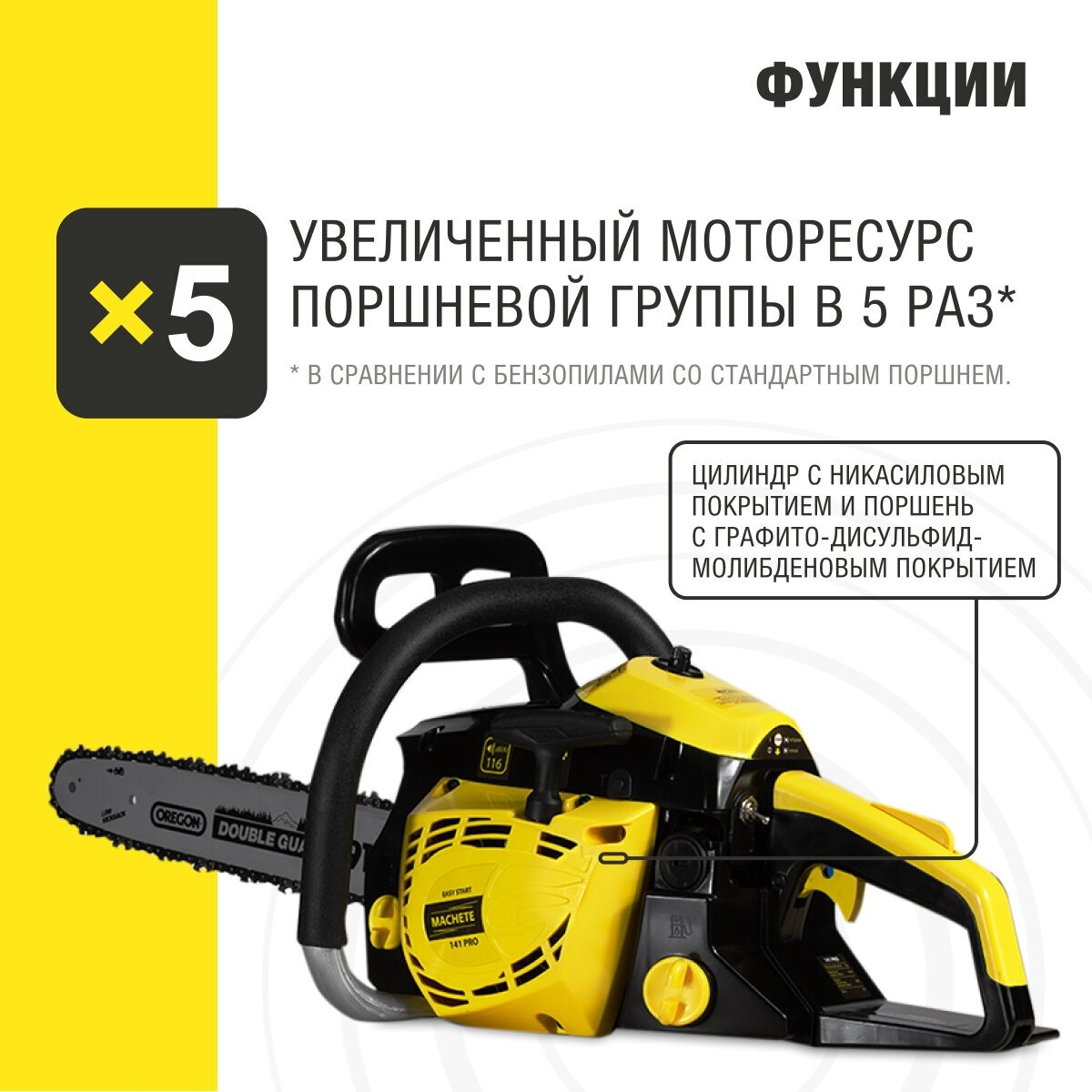 MACHETE PRO The petrol chain saw is designed for professionals. Main features: Increased engine life of the piston group by 5 times Nikasil-coated cylinder and piston with graphite-disulfide-molybdenum coating
