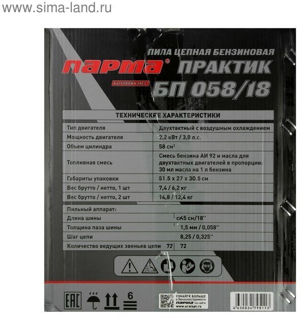 Engine type: gasoline, Power W: 2200 W, HP power: 3 HP, bar length: 45 cm, chain pitch: 0.325 inch, engine size: 58 cm³, cutting length: 450 mm, anti-vibration, smooth start, weight: 6.20 kg