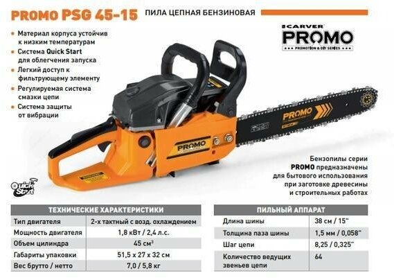 Chainsaw Carver PSG-45-15 1800W 2.4hp tire length 16 38cm