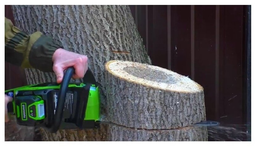 Contents of delivery: G-MAX 40V cordless chain saw, Greenworks 40V 4 Ah battery, Greenworks charger, chain, bar, packaging,