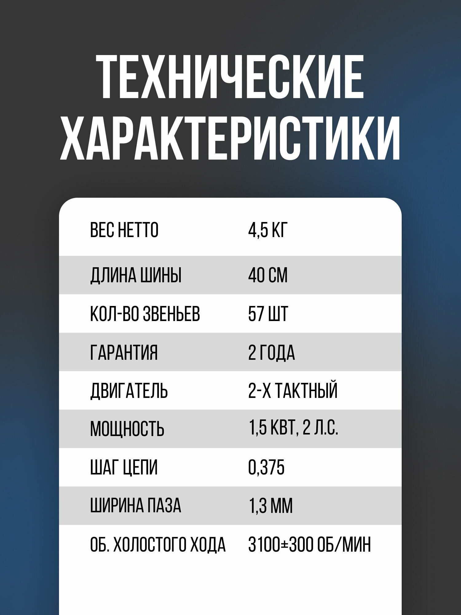 Peculiarities: Engine IC39 2-stroke; fuel gasoline AI-92/oil for 2-stroke engines 40:1; number of links 57 pieces; bar groove width 1.3 mm
