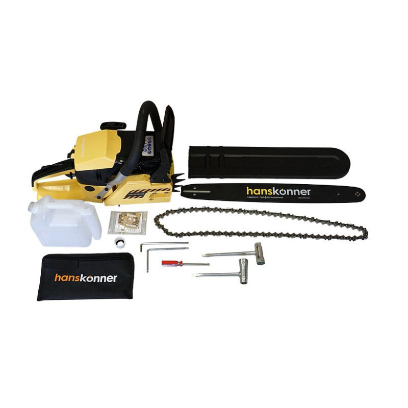 Combination wrench, plastic bar guard, saw bar, hex wrenches, saw chain, measuring container for fuel mixture preparation, toothed stop, documentation, screwdriver