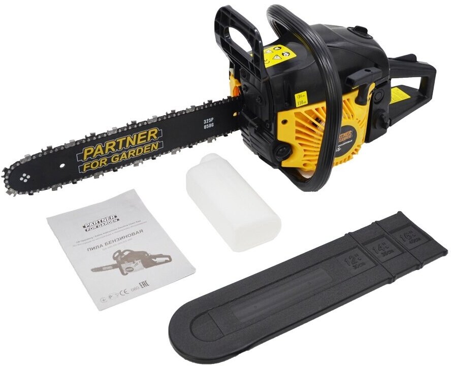 Chainsaw, chain, tire, plastic protective cover, tools, container for preparing the fuel mixture, instructions