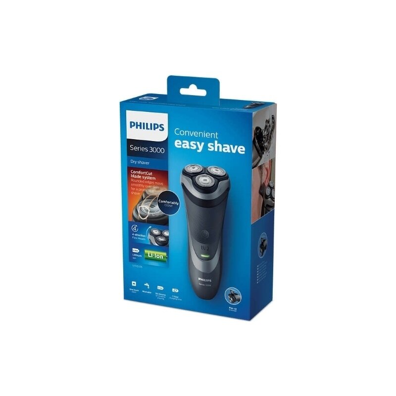 Razor type: rotary, shaving method: dry, power supply: autonomous/from the mains, features: fast charging, trimmer, number of shaving elements: 3, waterproof case, battery type: Li-ion, included: protective cover