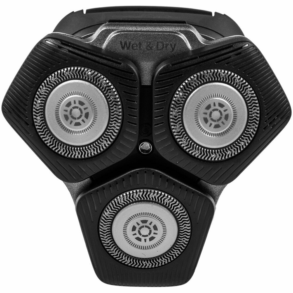 Razor type: rotary, shaving method: dry, power supply: autonomous, features: non-slip insert on the handle, trimmer, number of shaving elements: 3, battery type: NiMH, set includes: protective cover, cleansing brush