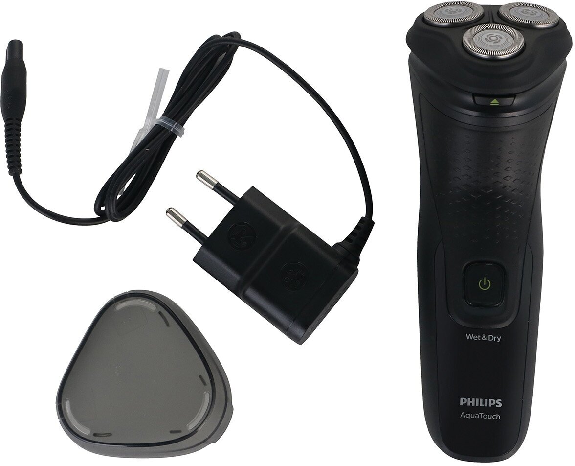Razor type: rotary, shaving method: dry, power supply: autonomous, features: non-slip insert on the handle, trimmer, number of shaving elements: 3, battery type: NiMH, set includes: protective cover, cleansing brush