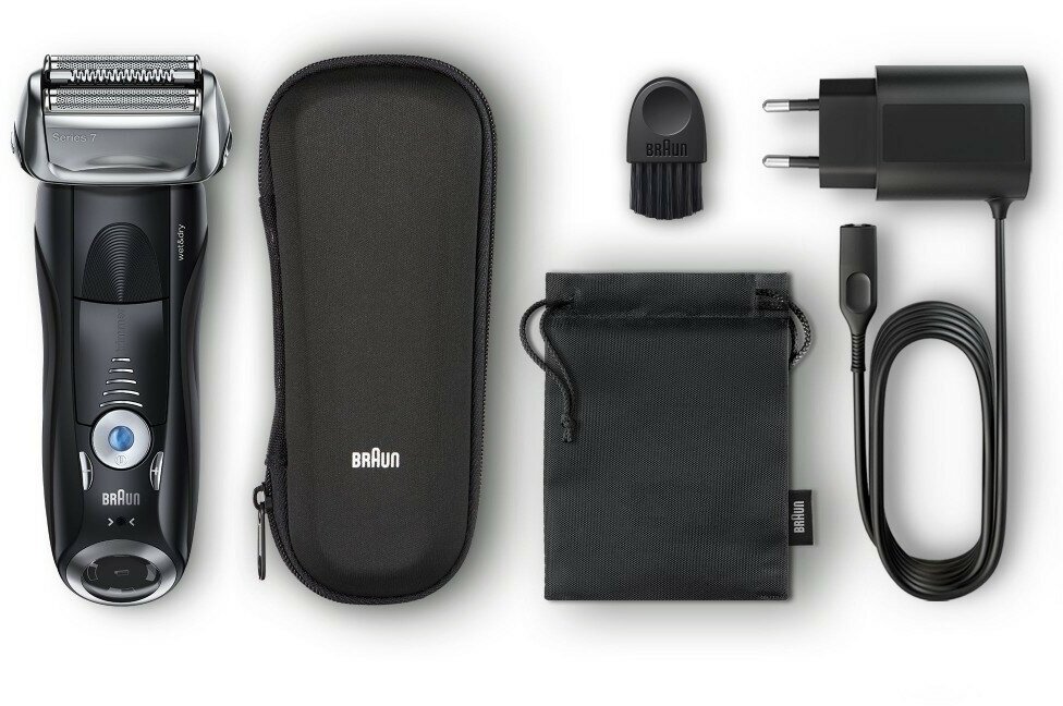 Razor type: rotary, shaving method: dry, power supply: autonomous, features: non-slip insert on the handle, trimmer, number of shaving elements: 3, battery type: NiMH, set includes: protective cover, cleansing brush