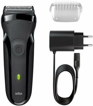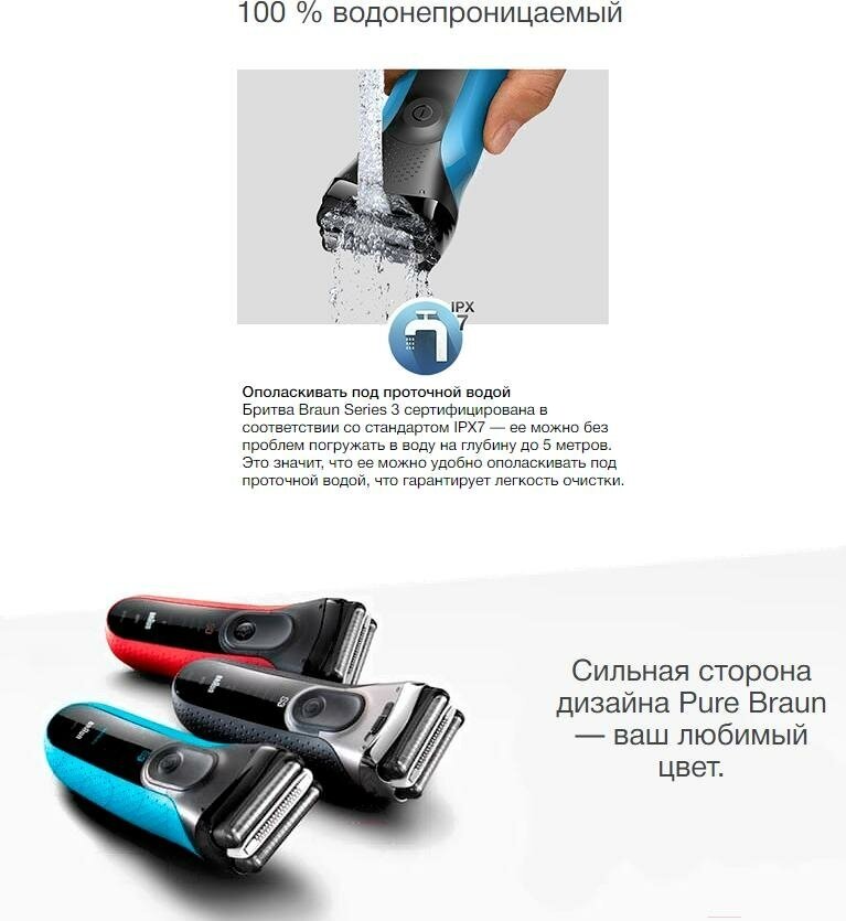 Razor type: foil, shaving method: dry, power supply: autonomous / from the mains, features: fast charging, non-slip insert on the handle, number of shaving elements: 3, waterproof case, battery type: NiMH,