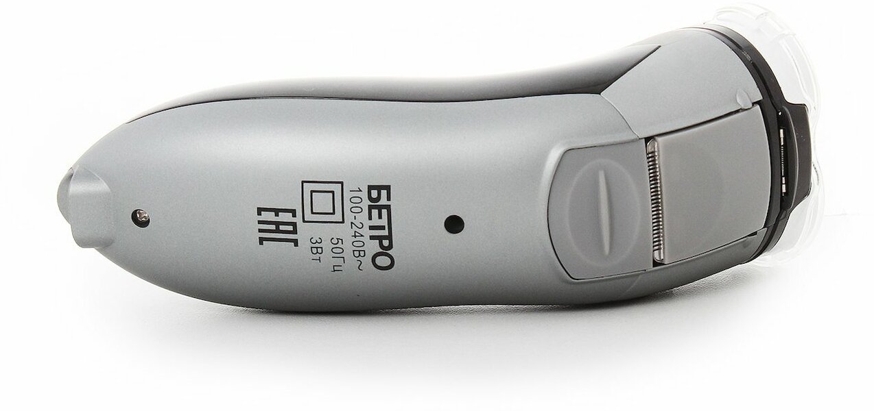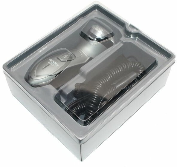 Razor type: rotary, shaving method: dry, mains powered, features: non-slip insert on the handle, trimmer, number of shaving elements: 3, set includes: travel case, protective cover, cleaning brush