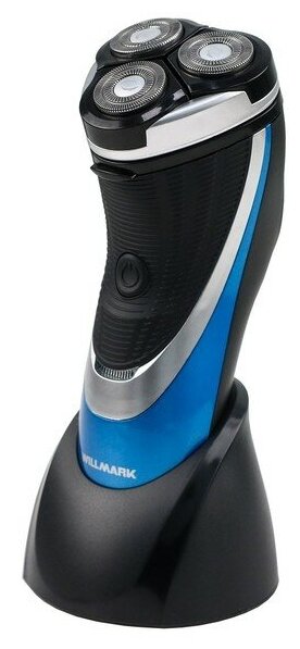 Razor type: rotary, shaving method: dry, power supply: autonomous, features: non-slip insert on the handle, trimmer, number of shaving elements: 3, battery type: NiMH, set includes: protective cover, cleansing brush