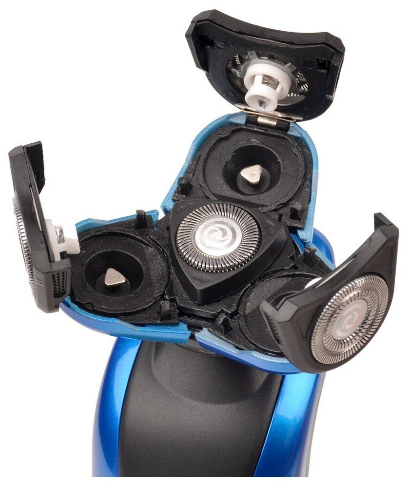 Razor type: rotary, shaving method: dry, power supply: autonomous, features: non-slip insert on the handle, trimmer, number of shaving elements: 3, battery type: NiMH, set includes: protective cover, cleansing brush