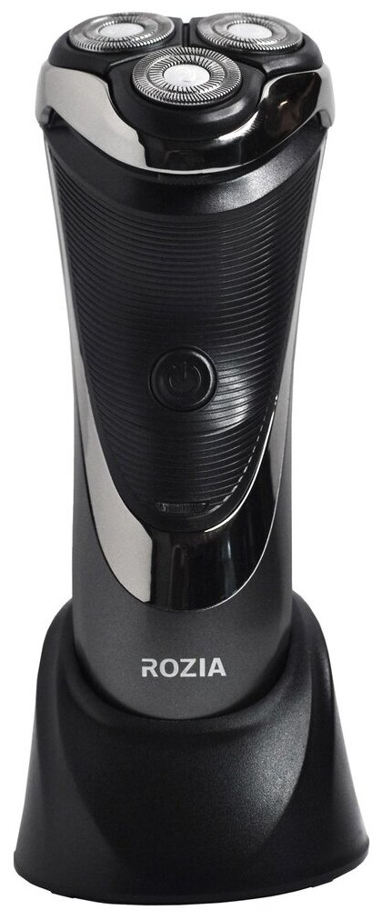 Razor type: rotary, shaving method: dry, power supply: autonomous, features: trimmer, number of shaving elements: 3, set includes: protective cover, charging stand, cleaning brush