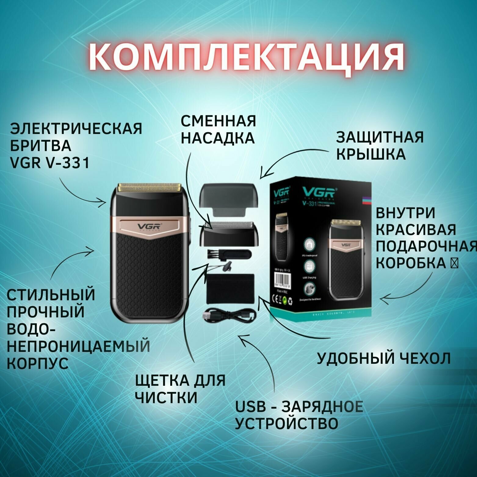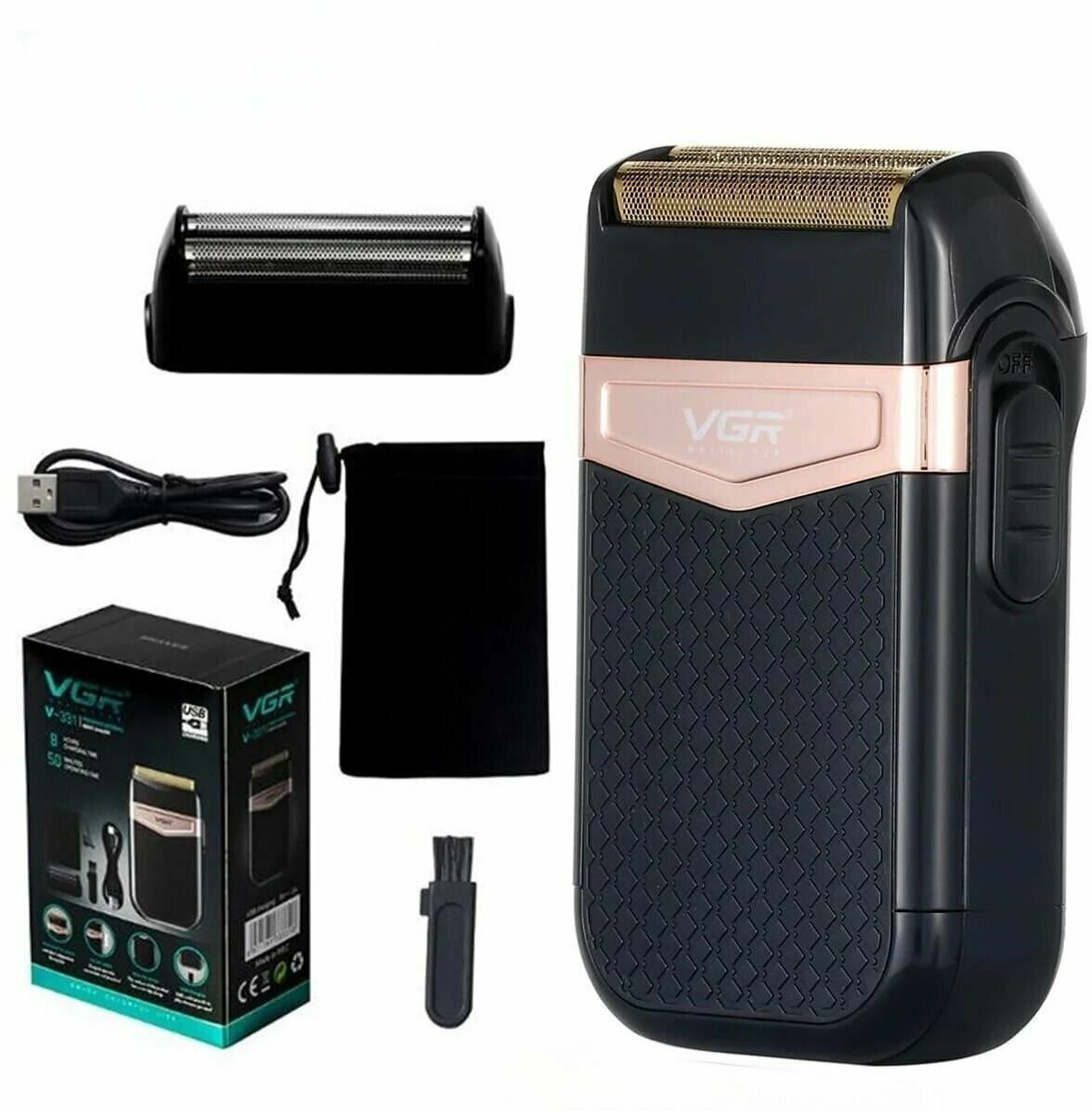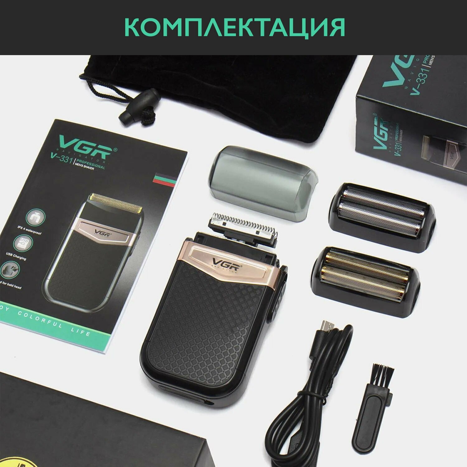 Shaver, spare foil, USB cable, velvet pouch, cleaning brush