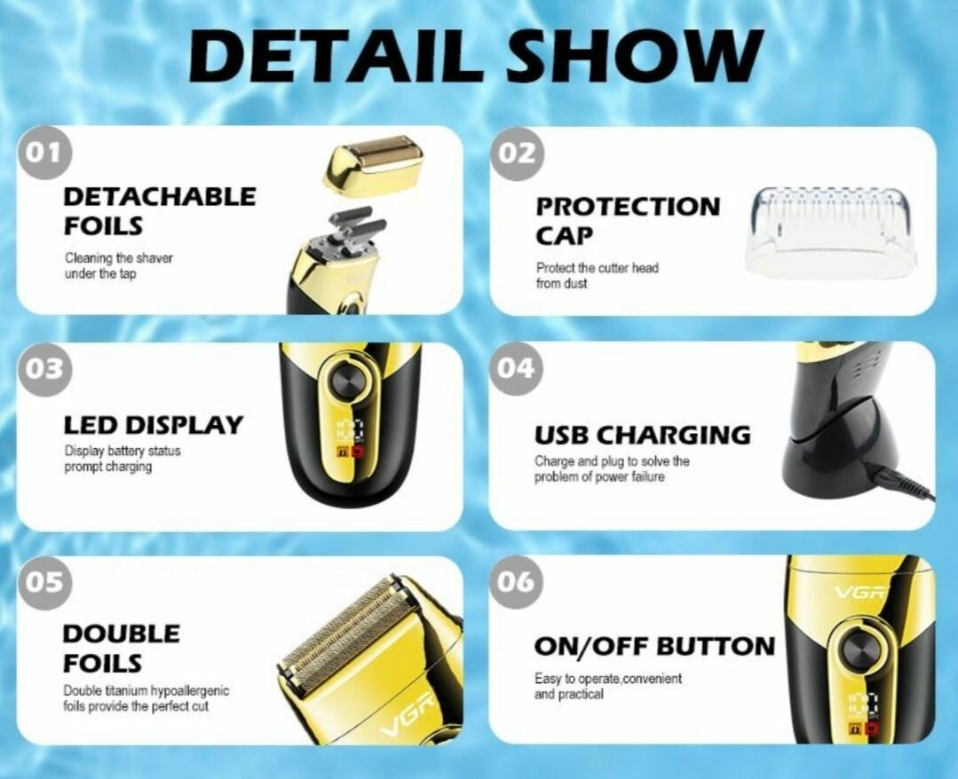 Electric shaver 1pc. Protective cover 1pc. USB cable 1pc. Brush 1pc. Instruction. Package