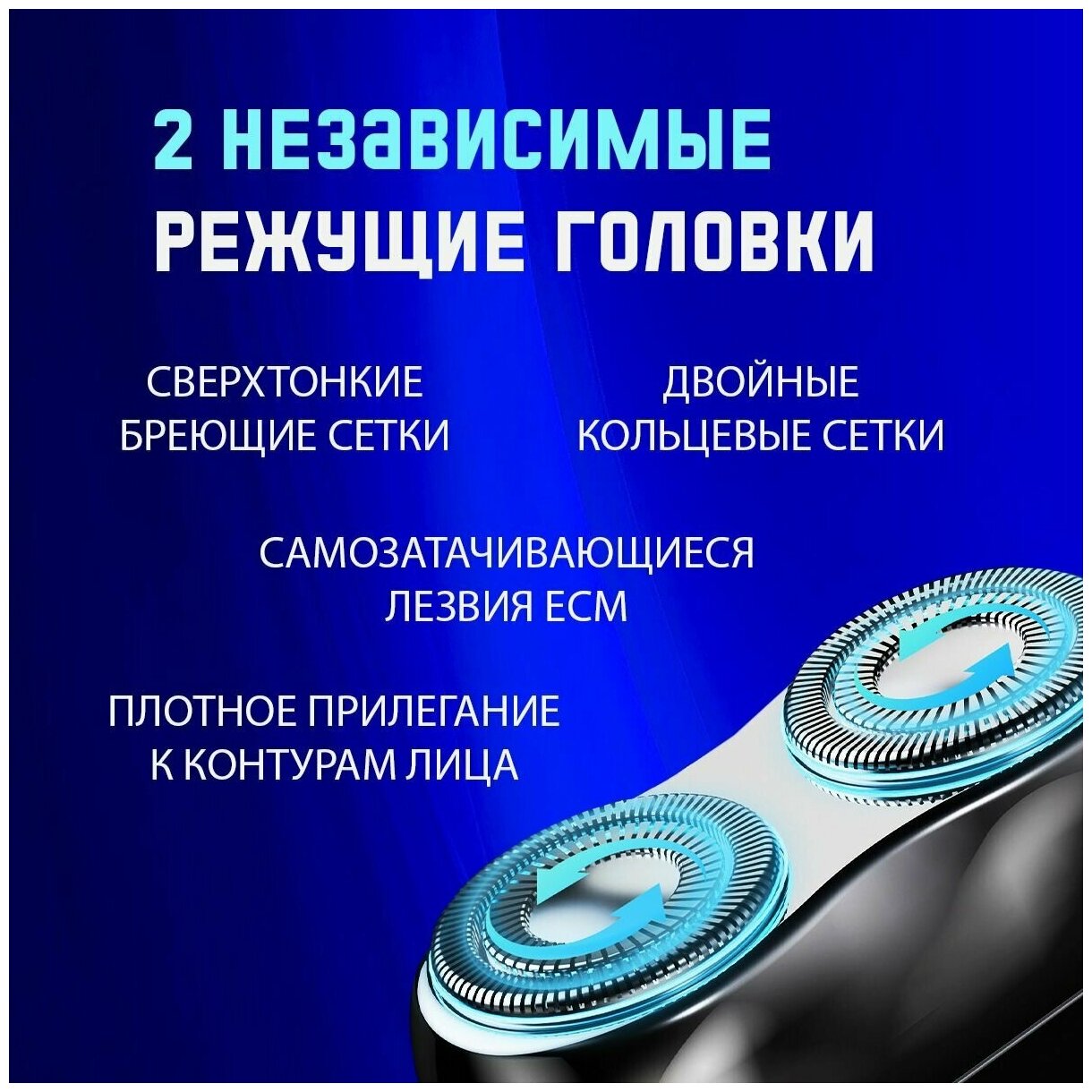 Razor type: rotary, shaving method: dry, power supply: autonomous, features: non-slip insert on the handle, trimmer, number of shaving elements: 3, battery type: NiMH, set includes: protective cover, cleansing brush