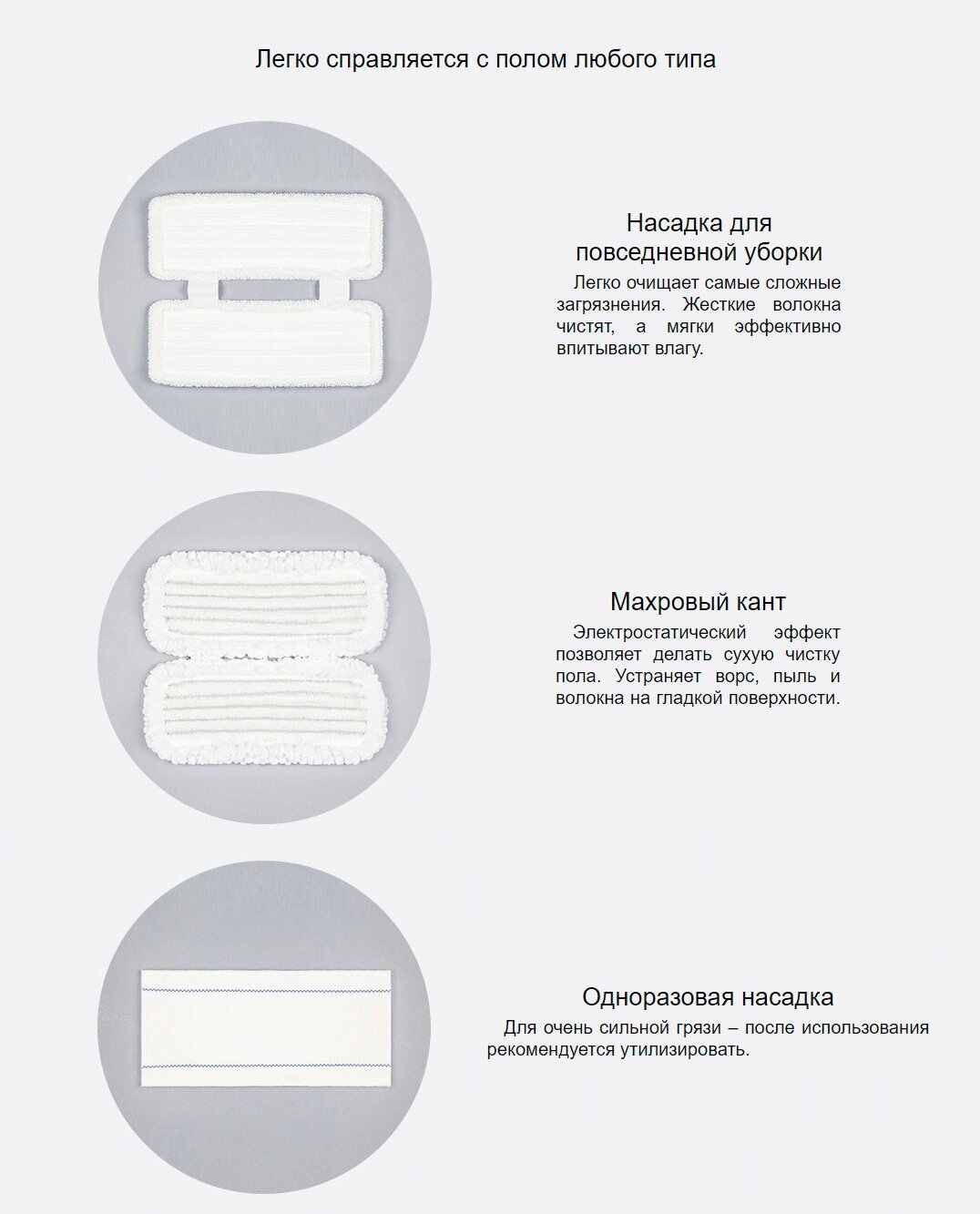 Set includes: mop, foldable handle, AC adapter, double nozzle 2 pcs., disposable nozzle 10 pcs., measuring cup