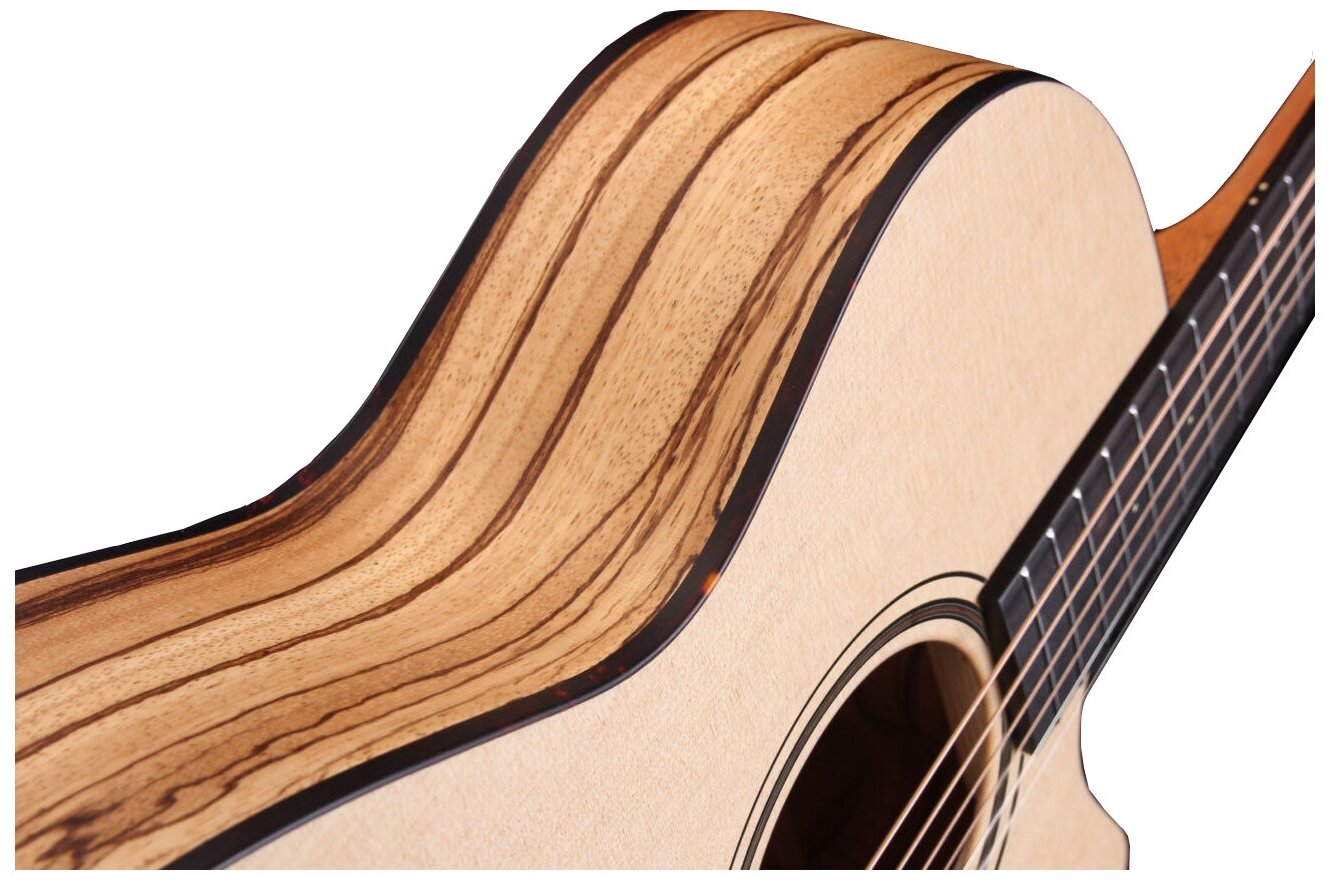 Type: western guitar, body type: orchestra model, orientation: right-handed, number of frets: 20, number of strings: 6, scale length: 650 mm, presence of pickup: without pickup, with cutout, body material: spruce, zebrawood, material
