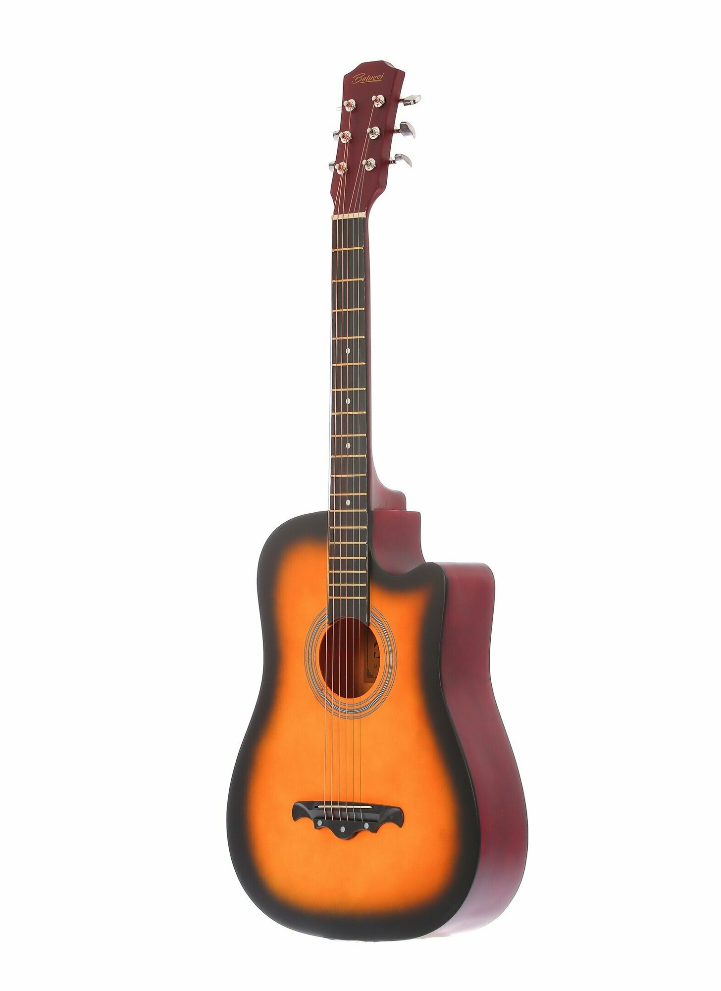 Type: western guitar, body type: folk, orientation: right-handed, number of frets: 18, number of strings: 6, cutaway, neck material: maple, color: gold