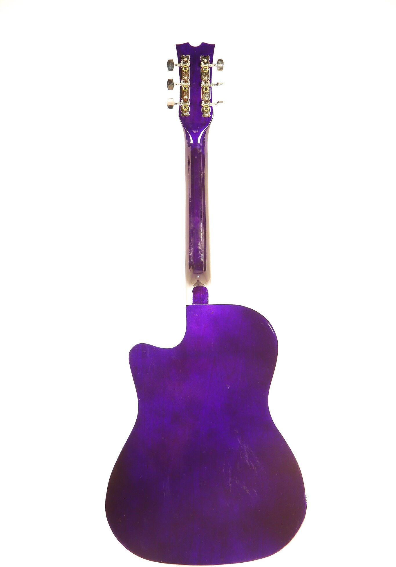 Type: western guitar, body type: folk, orientation: right-handed, number of frets: 18, number of strings: 6, cutaway, neck material: maple, color: purple