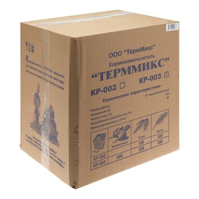 Productivity: grain 300 kg/hour, roots 500 kg/hour, grass 150 kg/hour; power 0.9 kW; electrical safety class I; equipped with a regulator to change the fraction