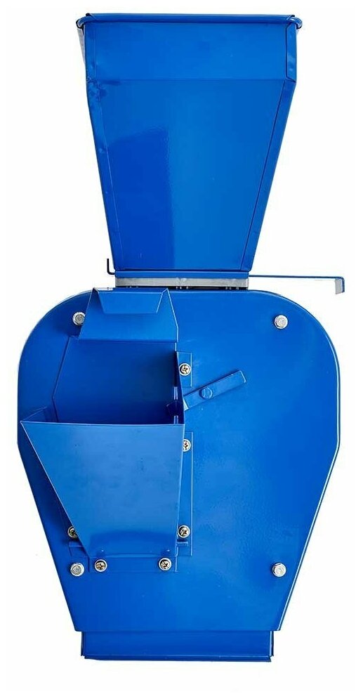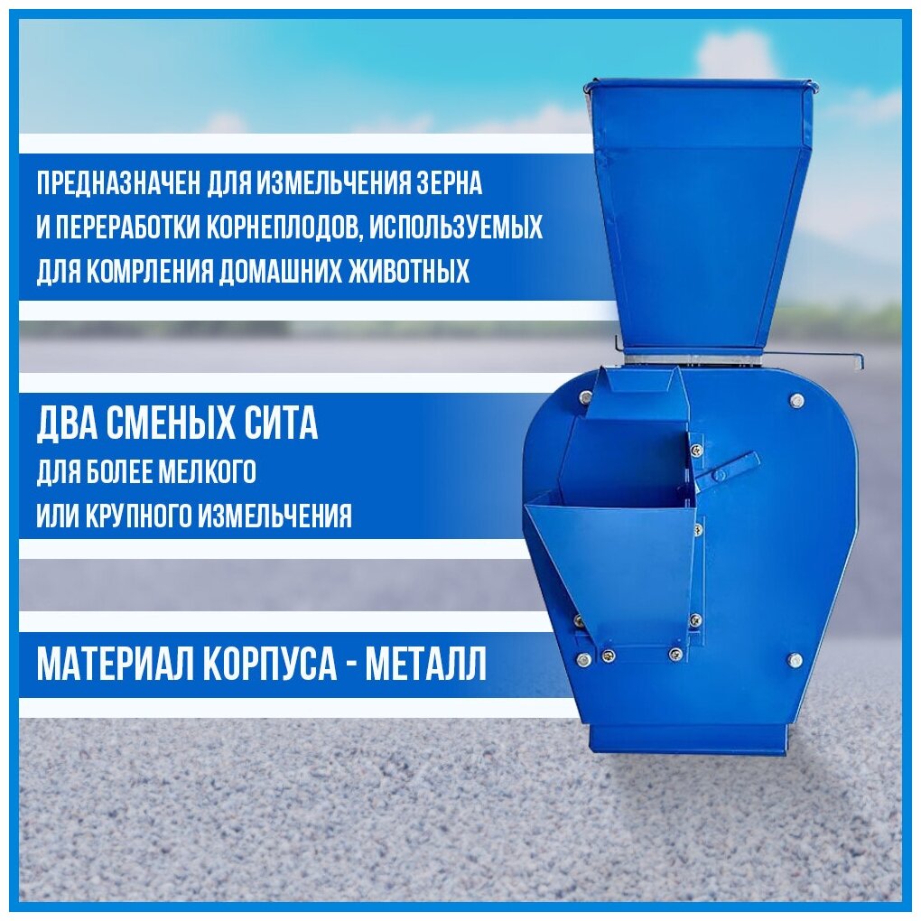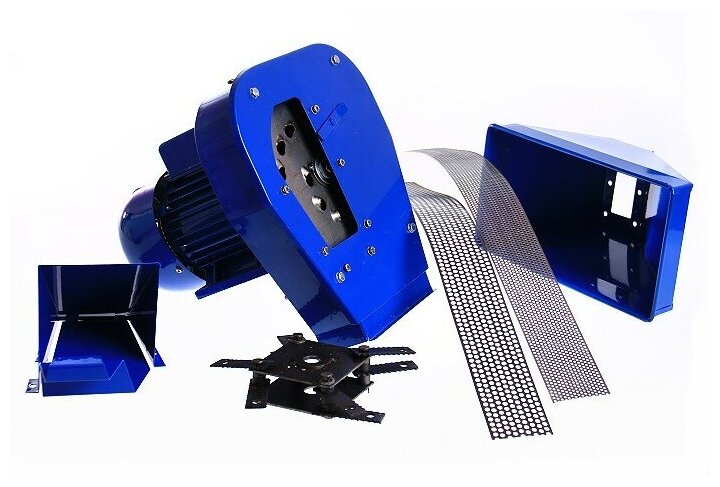 Grain crusher; loading tray for grain; loading tray for root crops; two sieves 2.5 mm and 5 mm; hammer knives; grater-knife; fixing kit