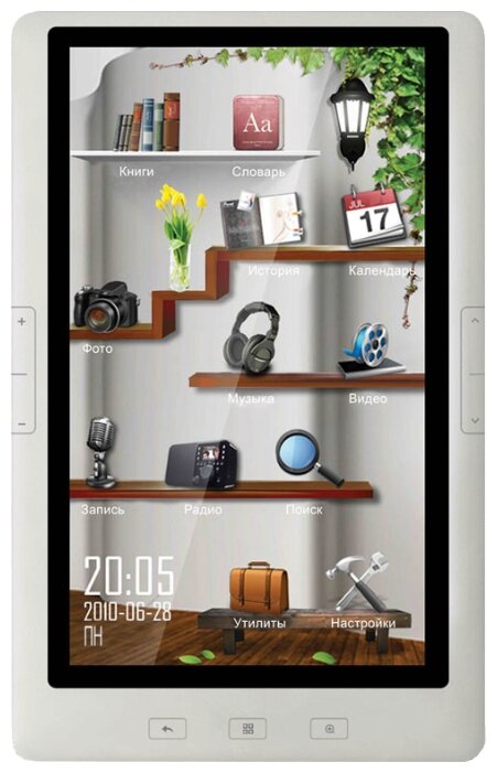 Dictionary; support for WMA, FLAC, WAV, OGG, APE, WMV, RM, AVI, RMVB, 3GP, FLV, MP4, DAT, VOB, MPG, MPEG, MKV, MOV; USB interface: yes; Charging from the network: yes; Support for formats: MOBI, HTML, XML, LCR; Processor frequency: 400 MHz