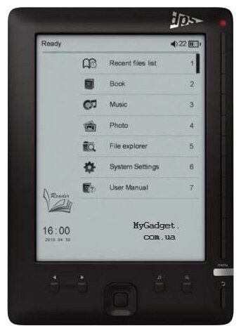 Display type: E-Ink, diagonal: 6, E-Ink display generation: Vizplex, design features: paging buttons, book and document formats: CHM, DJVU, DOC, EPub, FB2, HTML, PDF, RTF, TXT, resolution display: 800x600