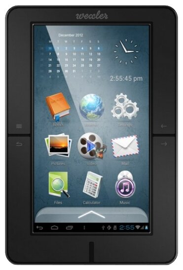Display type: LCD color, diagonal: 7, design features: built-in backlight, paging buttons, touch screen, book and document formats: DJVU, DOC, EPub, FB2, HTML, PDF, PalmDOC, RTF, TXT, display resolution: 800x480 android