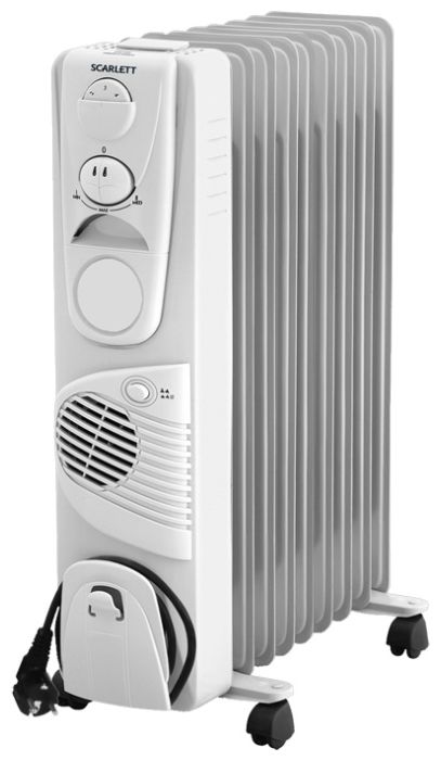 Cord compartment; wheels for moving; power adjustment; switch with light indicator; fan